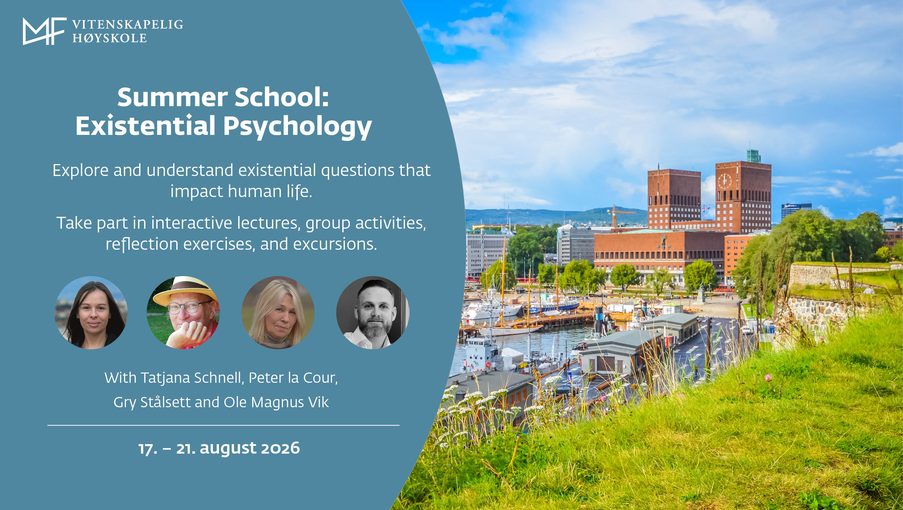 Gjennom uken kan du delta i interaktive forelesninger, gruppearbeid, refleksjonsøvelser og utflukter. Du vil få både teoretisk innsikt og praktiske verktøy for å forstå og håndtere livets eksistensielle dimensjoner – samtidig som du får muligheten til å oppleve og utforske vakre Oslo.