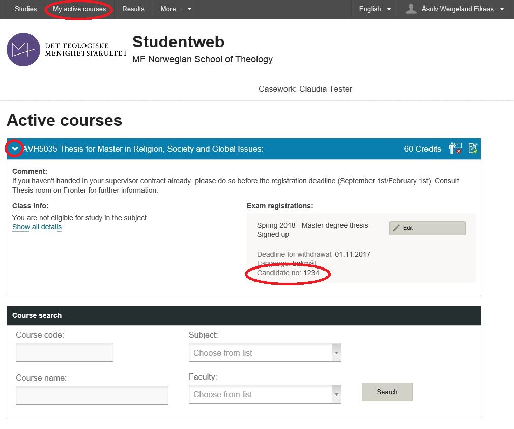 - That you have used your candidate number on the cover page (The candidate number will normally be made available in StudentWeb two weeks before the submission deadline. See this picture for the exact location).