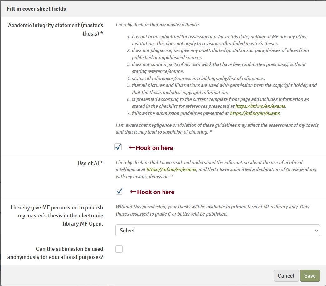- Publication: You must decide whether you want MF to publish your thesis electronically. Read more here: