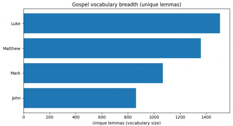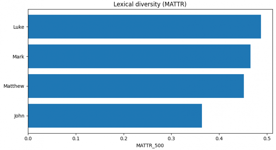 To explore vocabulary size across the four Gospels, we treated each text as a corpus and measured lexical diversity computationally. After removing stopwords (such as "the”), lemmatizing words (so “say” and “says” count as the same word), and excluding proper names, we calculated two related but distinct measures. First, we counted the number of unique lemmas in each Gospel, which gives a sense of overall vocabulary breadth. Second, we calculated the Moving-Average Type–Token Ratio (MATTR), a length-sensitive measure of lexical diversity that reduces the bias introduced by longer texts naturally accumulating more unique words. The first bar chart shows which Gospel uses the largest number of different word forms overall; the second shows which Gospel is lexically most diverse relative to its length.
