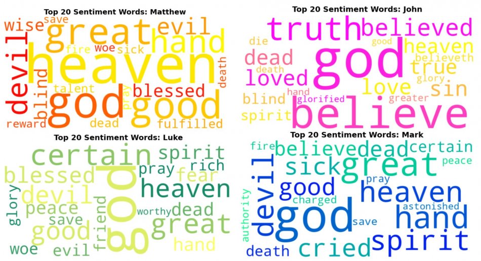 Matthew and Luke provide a balanced mix of moral and spiritual language, such as heaven, good, and blessed. The most striking contrast appears between Mark and John. Mark presents a "crisis narrative," where the sentiment cloud is more dramatic and action-driven, with terms like cried, astonished and devil. In John, the cloud centers instead on a high-frequency set of more positive core concepts, such as believe, love, and truth.