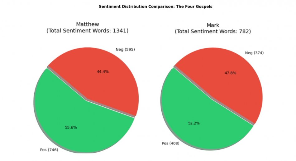While all four gospels are mostly positive, some are more negative than others. Mark (47,8%), for instance, shows a larger negative distribution than John (39,1%), indicating his focus on the crisis and suffering of the narrative.