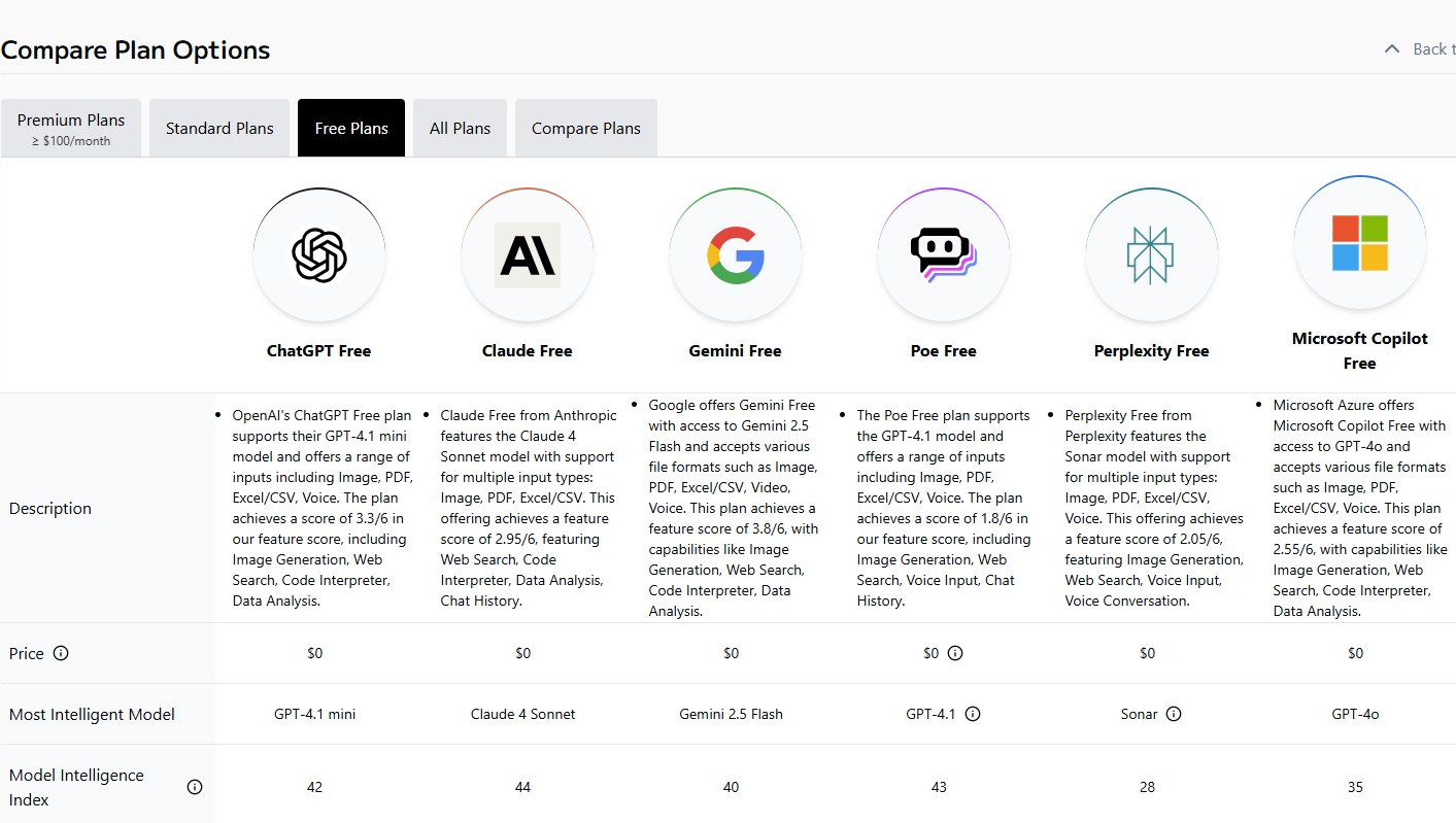 Leaderboards such as Artificial Analysis show that the model used in Claude Free (Sonnet 4) is more intelligent than the model mostly used in ChatGPT Free (GPT 4.1 mini) and Gemeni’s 2.5 Flash.