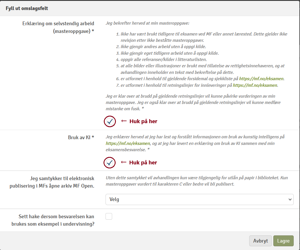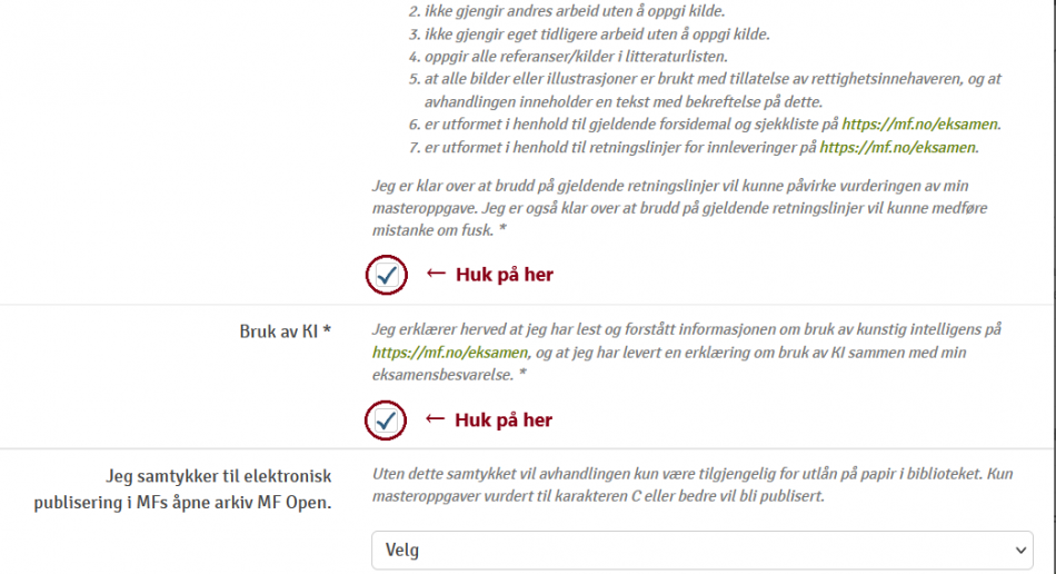 - Publisering: Du må ta stilling til elektronisk publisering etter at du har lastet opp oppgaven. Les mer om publisering: