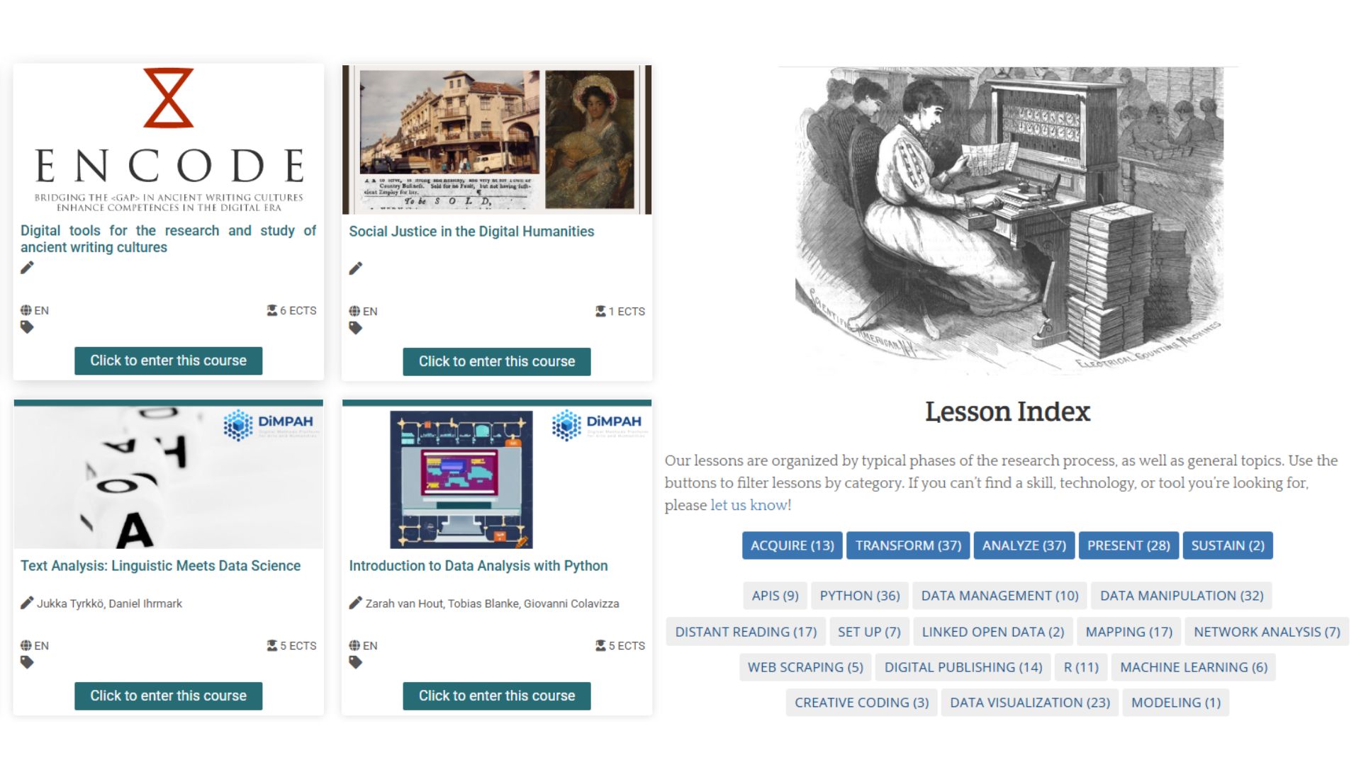 A wide range of open resources and online courses are available to help researchers build digital skills. We want to highlight three particularly valuable platforms: DARIAH Teach, The Carpentries, and The Programming Historian. Each provides practical, well-structured learning materials that align closely with the needs and interests of researchers at MF.