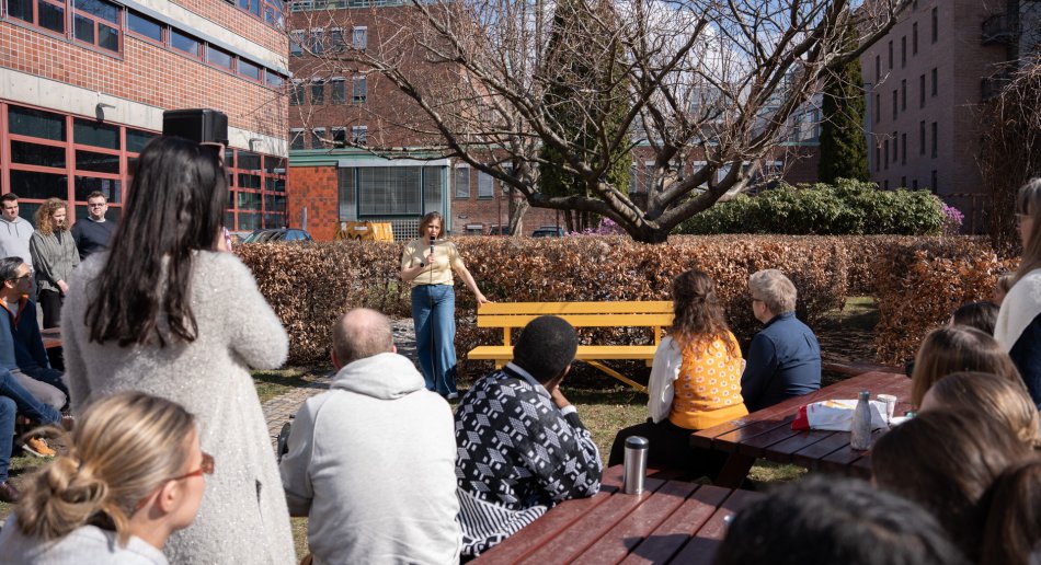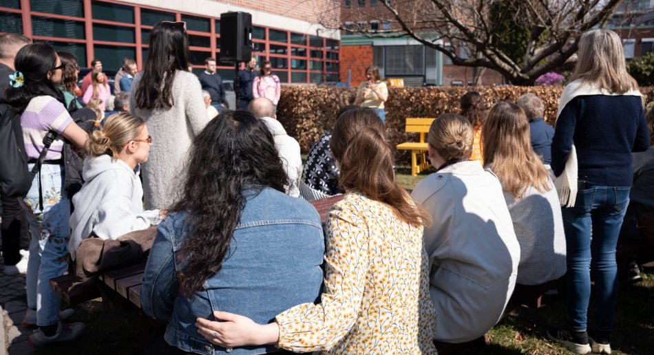 – Siste dagen Tamima var her som en av våre studenter, satt hun her ute på en benk med sine venner og snakket om alt mulig. For det er jo sånn når vi er sammen og blir glad i hverandre – da møtes vi og snakker om alt mulig rart. Denne benken er et sted å minnes at Tamima var en del av oss – og alt det hun lærte oss. Et sted som minner oss om betydningen av fellesskap, og om at vi aldri må slutte å snakke sammen. Vi håper benken blir brukt, og at den får stå her og lyse, slik at vi husker hvor viktige hver enkelt av oss er, sa Studentprest Elise under markeringen.