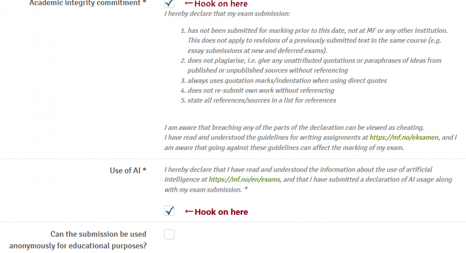 - If you can't find the solution, contact the exam office (exam@mf.no). Is the submission deadline is close, include the the submission file as an attachment.