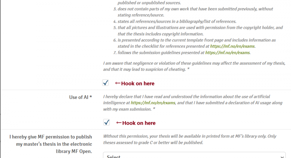 - Publication: You must decide whether you want MF to publish your thesis electronically. Read more here: